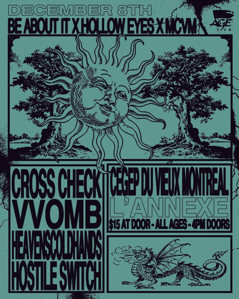 | Event: ALL AGES Matinee Show: Cross Check VVOMB Heavenscoldhands Hostile Switch @ Cegep |