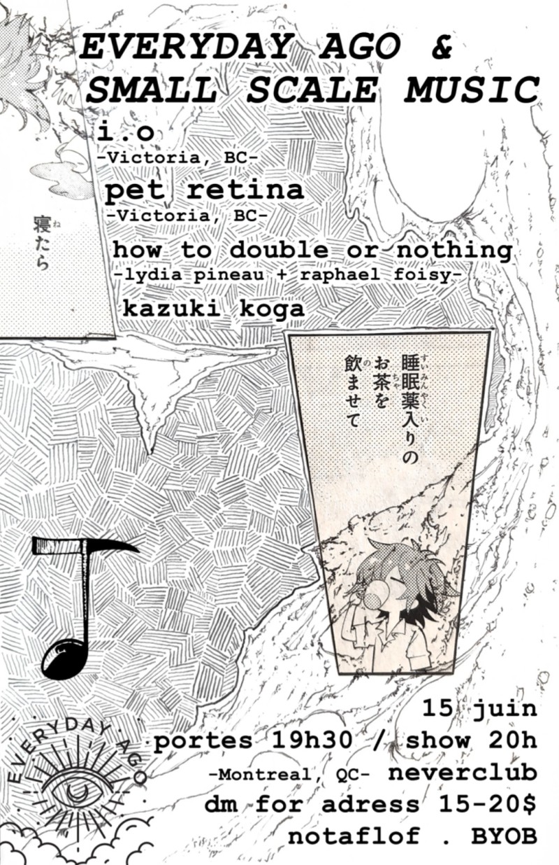 | Event: EVERYDAY AGO-SMALL SCALE MUSIC: I.o, Pet Retina, Kazuki Koga, How To Double Or Nothing, |