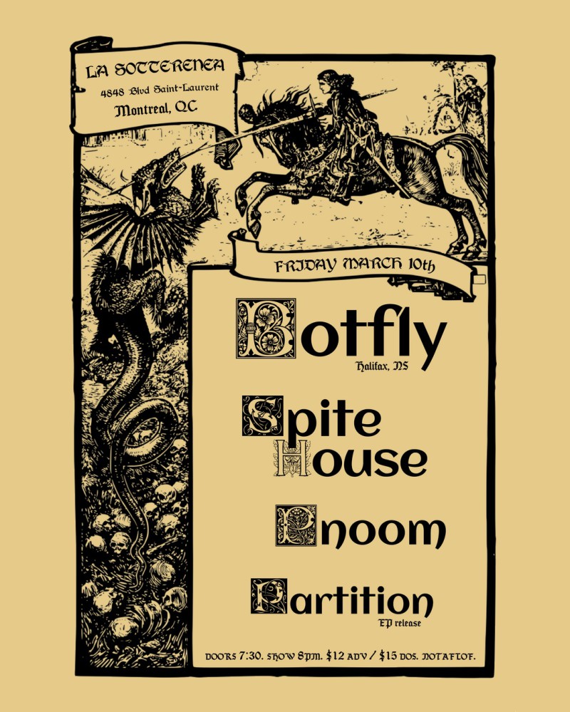 | Event: Fri 03, 10: BOTFLY, SPITE HOUSE, PNOOM, PARTITION @ La Sotterenea |
