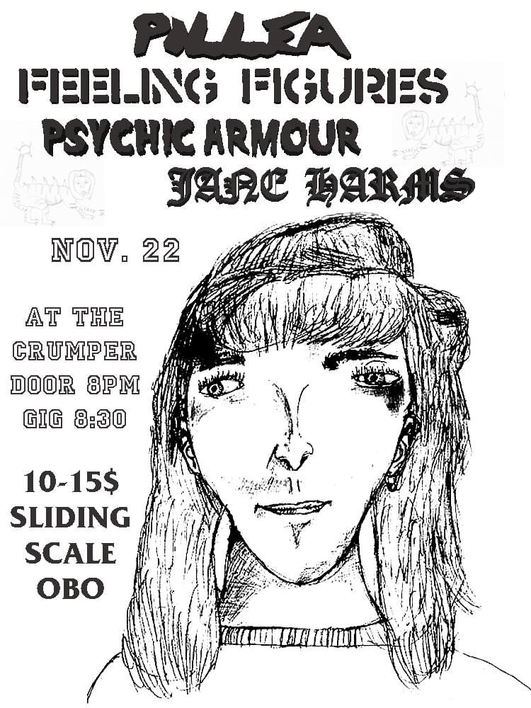 | Event: PILLEA (emo, Punk, Toronto) FEELING FIGURES (Lo-Fi Indie) PSYCHIC ARMOUR (Fuzz-Punk) JANE HARMS (Bed |
