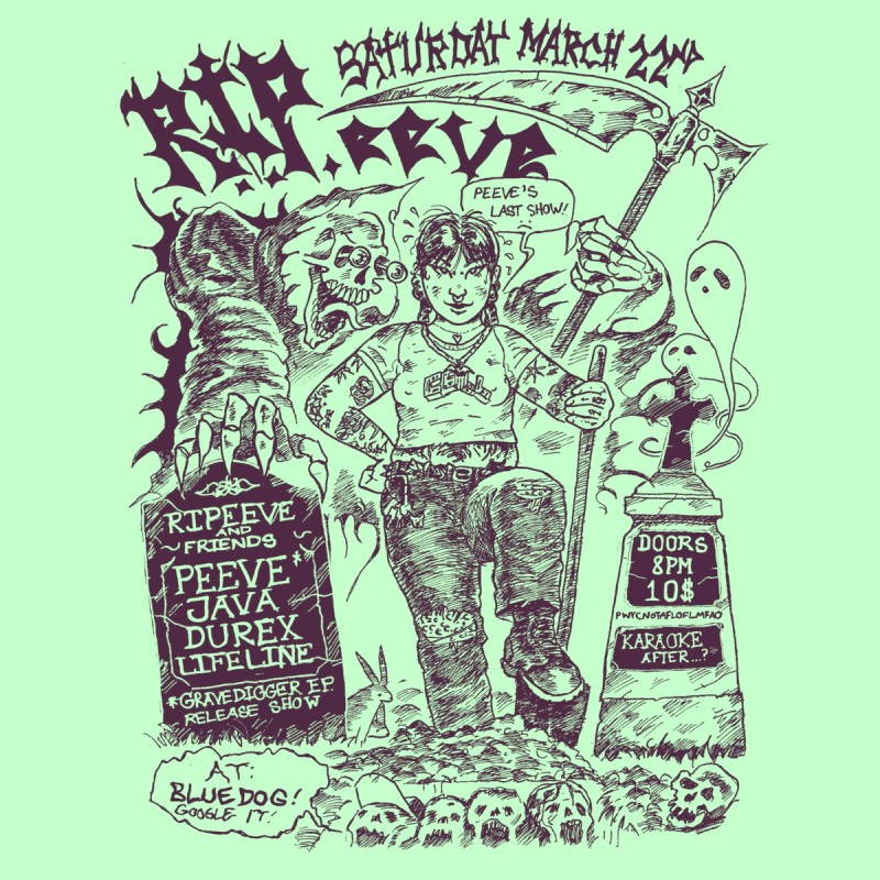 | Event: R.I.PEEVE,,, PEEVE GRAVE DIGGER RELEASE JAVA, DUREX, LIFELINE @ BLUE DOG |
